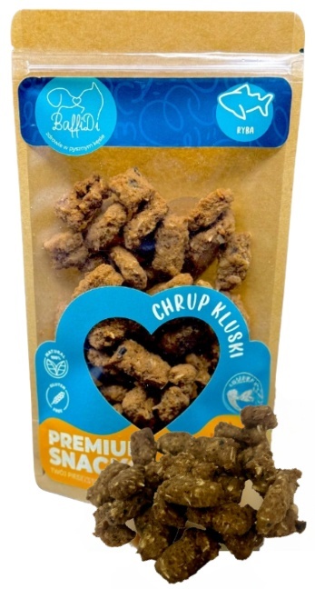 Baffidi Kluski z łososia - to ciekawa, chrupiąca przekąska, która sprawi, że wspólna zabawa i trening z psem staną się jeszcze przyjemniejsze. Ten naturalny przysmak powstaje z zaledwie trzech składników: łososia, oleju z łososia i świeżych jaj. Delikatny proces suszenia ciepłym powietrzem zachowuje pełnię wartości odżywczych, a jednocześnie zapewnia bezpieczeństwo mikrobiologiczne bez konieczności stosowania konserwantów czy sztucznych dodatków.