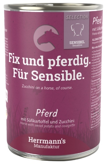 Herrmann's Manufaktur Selection Sensitive Konina z cukinią i batatami - to wysokiej jakości, pełnoporcjowa karma monobiałkowa dla dorosłych psów, idealna dla zwierząt z alergiami, nietolerancjami pokarmowymi lub na diecie eliminacyjnej. Konina jest mięsem chudym, lekkostrawnym i bogatym w łatwo przyswajalne białko, dzięki czemu sprawdzi się także w diecie psów wrażliwych oraz seniorów.