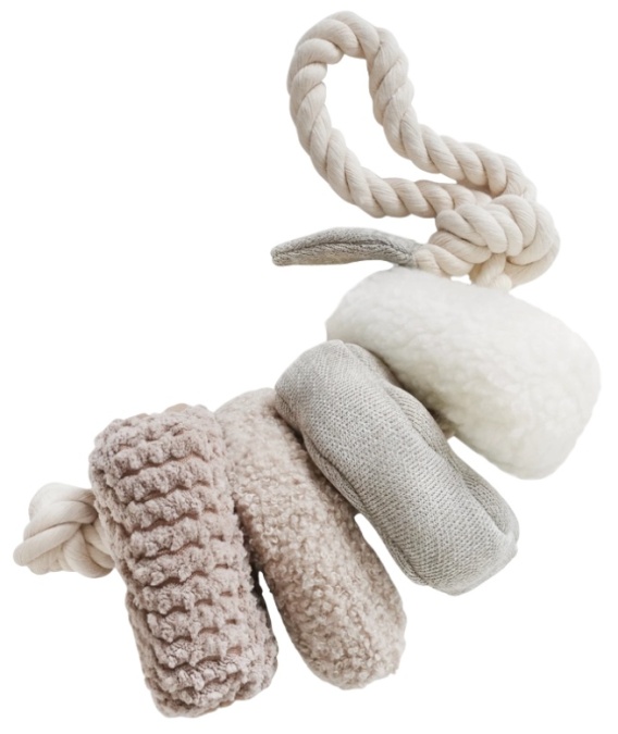 W zestawie najdziesz cztery wyjątkowe moduły, które można wiązać na dołączonej linie lub łączyć między sobą. Cloud Onigiri to mięciutki element z polaru z trzema mini piszczałkami, który zachęca do lekkiego podgryzania i zabawy sensorycznej. Grey Chewer wykonany z tkanej nylonowej struktury ma wyraźne rogi, które świetnie sprawdzają się jako element do żucia i masowania dziąseł. Oat Diamond to pluszowy, „misiowy” moduł z dwoma piszczałkami, który daje psu dużo motywacji do zabawy. Taupe Squarepants w miękkim sztruksie posiada kieszonki na smaczki, dzięki czemu możesz stworzyć dodatkowe wyzwania węchowe.